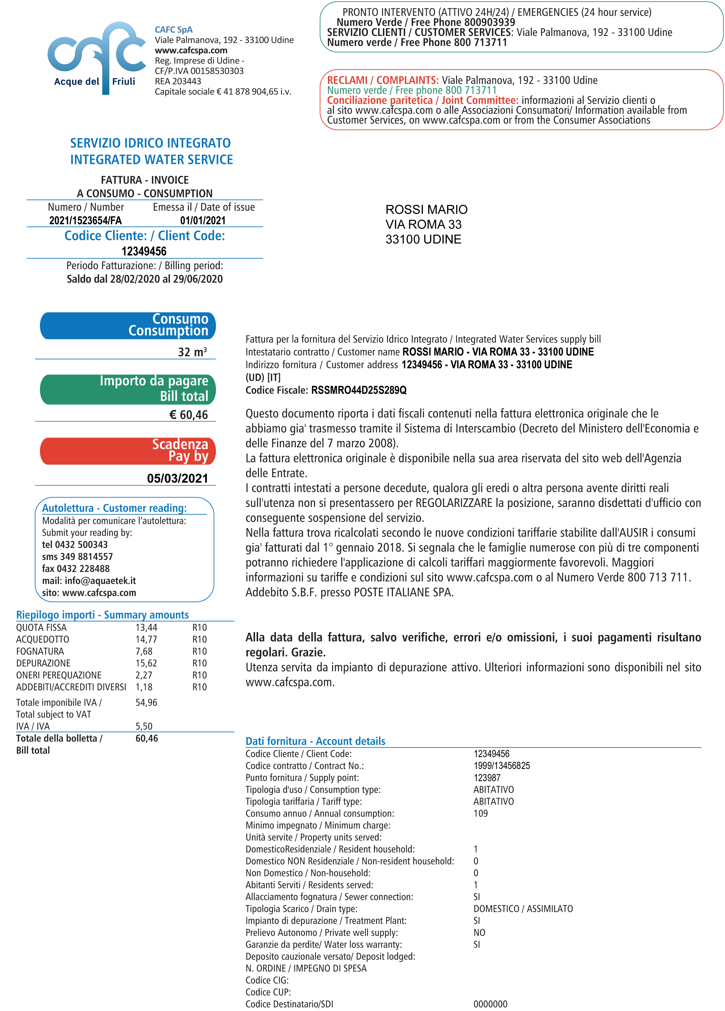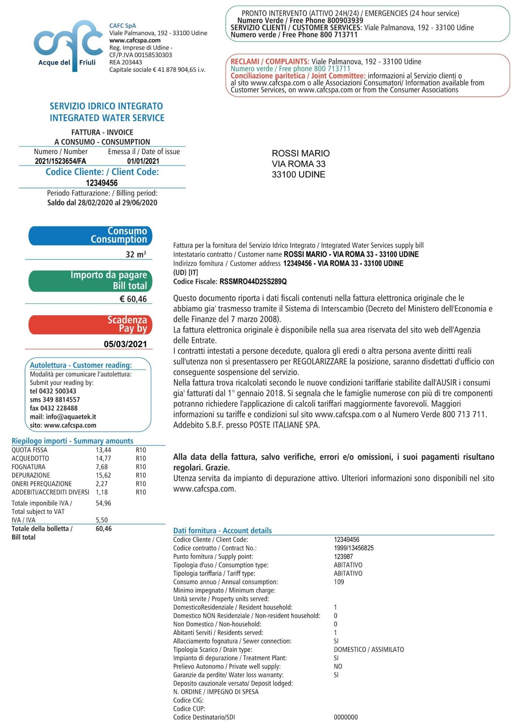 Di seguito è indicato lo Scarico Rete Fognaria/Impianto di Depurazione, cioè se l'utenza risulta allacciata o meno alla rete fognaria, e di conseguenza se recapita in un impianto di trattamento, viene assoggettata agli oneri previsti dalla legge sulla base dei consumi registrati e la tipologia d'uso. Eventuali situazioni non corrette vanno prontamente comunicate al Call Center (800 713 711), anche per evitare onerosi ricalcoli.