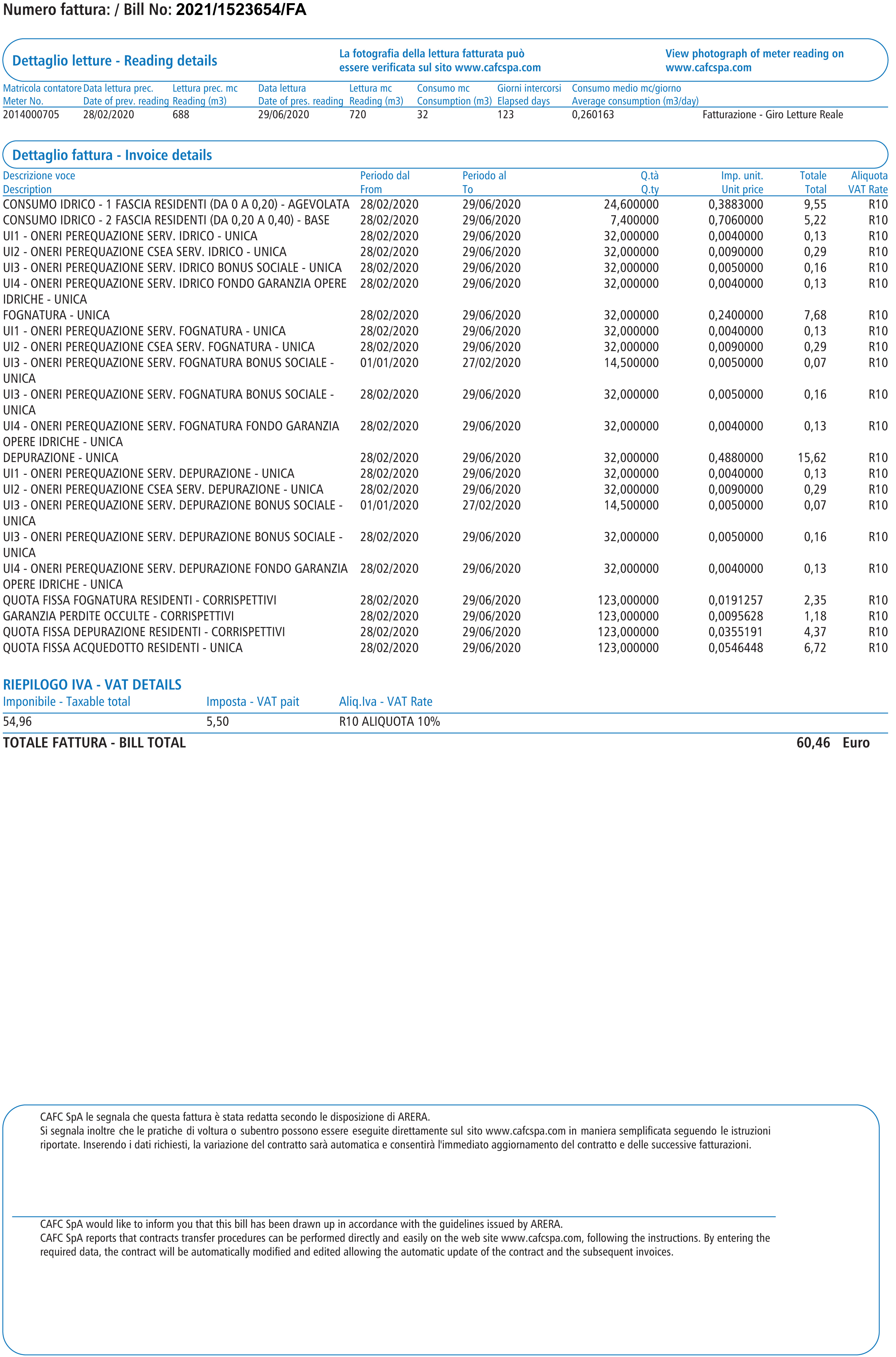 Se l’utenza è soggetta agli oneri di FOGNATURA e DEPURAZIONE la tariffazione di tali servizi è calcolata sugli effettivi volumi rilevati. Pertanto i consumi dei periodi vengono moltiplicati per le tariffe unitarie previste.