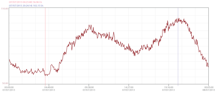 Nelle ore notturne la portata richiesta è bassa (è comunque presente a causa di consumi industriali, eventuali perdite, ospedali…), mentre durante la giornata si notano due picchi, uno in corrispondenza della mattina (fabbisogni domestici e fisiologici, attività industriali in corso) e uno nelle ore serali (consumi domestici quali il lavaggio delle stoviglie, l'igiene personale).